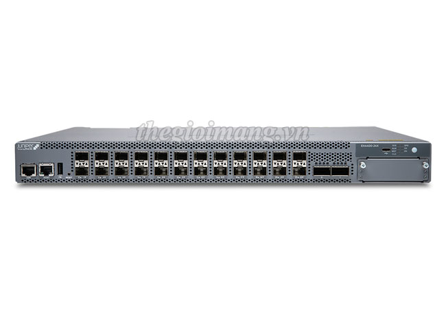 EX4400-24X-AFI, cung cấp 24 cổng 1/10GbE SFP+, hỗ trợ tùy chọn 4 x 1/10GbE SFP+, 4 x 1/10/25GbE SFP28 và 1 x 100GbE QSFP28 mô-đun mở rộng, hai cổng 100GbE chuyên dụng hỗ trợ kết nối Virtual Chassis và có thể được sử dụng làm cổng Uplink.